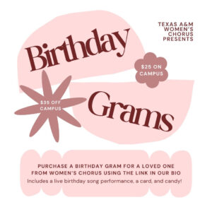 The link for the purchase form is located here! Please fill this out and our Birthday Gram Coordinator will contact you. Thanks and Gig ‘em!”